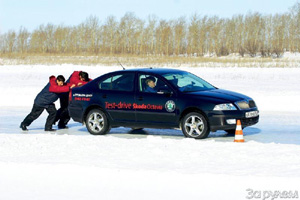 Наступает черед разгонов и торможений. И... первая неожиданность: на двух спущенных колесах «Шкода» не то что разгоняться, даже трогаться не хочет. В рыхлом снегу слишком велико сопротивление качению спущенного заднего колеса: оно буквально складывается, приподнимая над дорогой середину протектора. Шипованное («Нокиан») проворачивается рывками, а нешипованное («Пирелли») и вовсе стоит на месте. В предыдущем упражнении на укатанном снегу сопротивление качению было ниже, а сцепление – выше, поэтому такой проблемы не возникало.